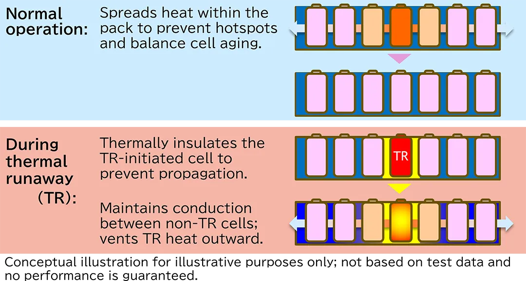 As lithium-ion batteries continue to increase in power density, across mobility, stationary energy storage (ESS), and server UPS applications, balancing safety and thermal performance is a shared challenge. Conventional approaches often rely on low-thermal-conductivity insulation for thermal-runaway countermeasures, which can compromise heat dissipation during normal operation and lead to complex multi-material designs.