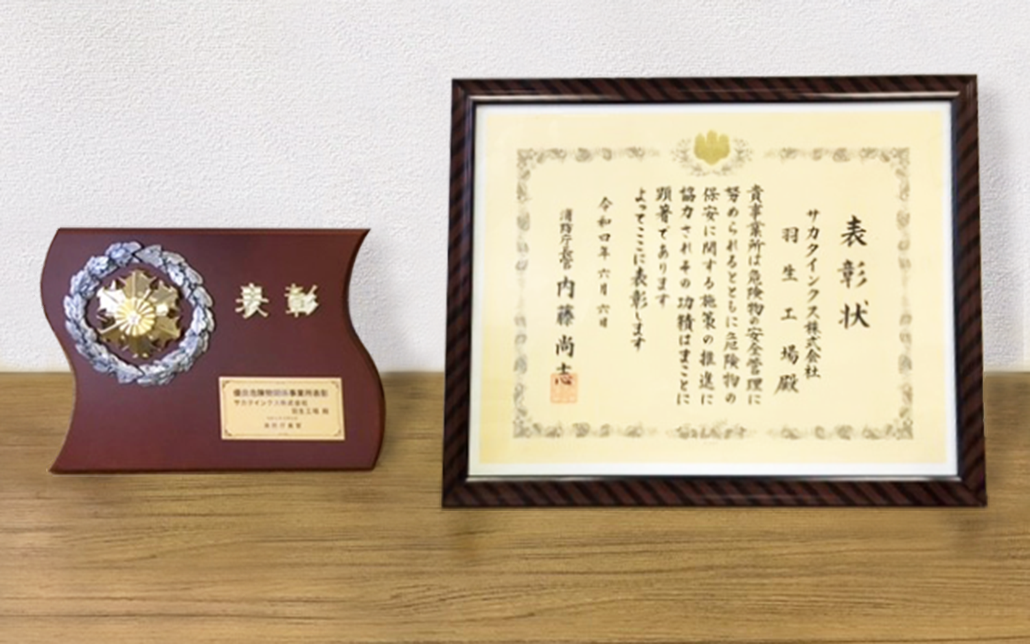 優良危険物関係事業所表彰は、危険物施設や危険物取扱いに係る保安措置の自主的かつ積極的推進、危険物の安全管理に関する教育の徹底などを通じて危険物保安行政の推進に協力し、国民生活の安全確保に顕著な功績のあった危険物関係事業所に対して贈られる賞です。