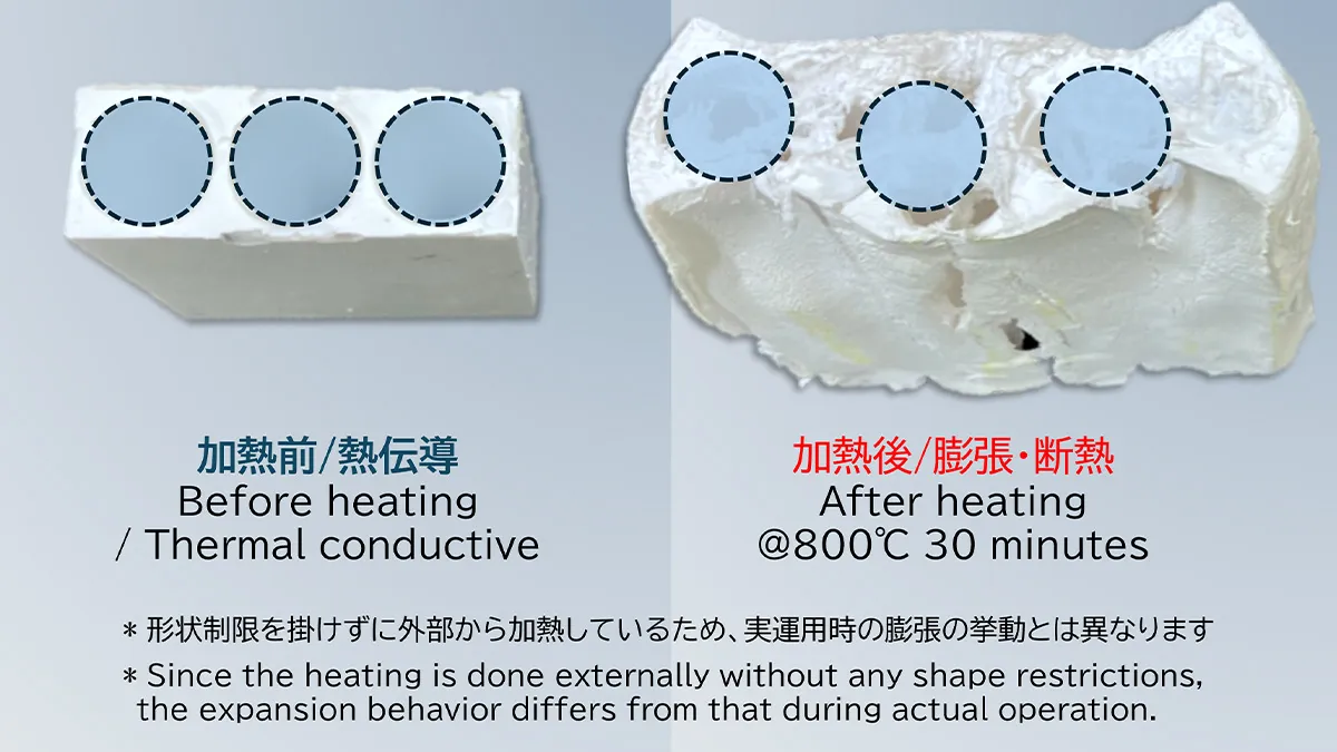 図は成形物を800℃の炉で30分加熱した後の状態を示しています。加熱により膨張が生じ、断熱性の発現が観測されています。