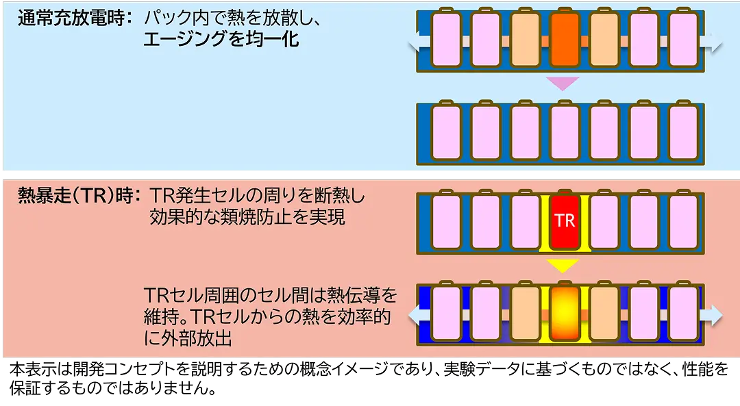 セル周りに充填された Thermorphous™ FX25(開発品)は、通常の充放電で生じる熱をパック内へ放散する挙動を示し、局所的な発熱が生じた場合でも周辺へ熱を分散させることでセルのエージング(劣化)の均一化に寄与する可能性があります。