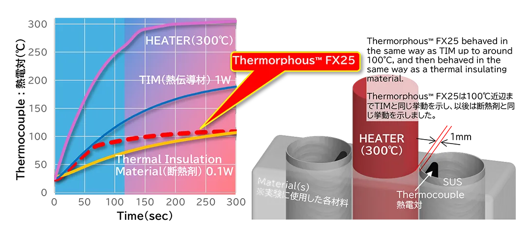 隣接セルを模した金属筒とヒーターを1mmの間隔で配置し、Thermorphous™ FX25(開発品)を充填したうえで、ヒーター温度を300℃まで昇温する熱移行試験を行いました。本図は、熱伝導材および遮熱材を充填した場合との比較結果を示しています。Thermorphous™ FX25は約100℃付近まで熱伝導材と同様の挙動を示し、その後は遮熱材に近い挙動へ移行することが観測されています。