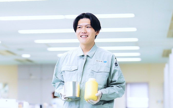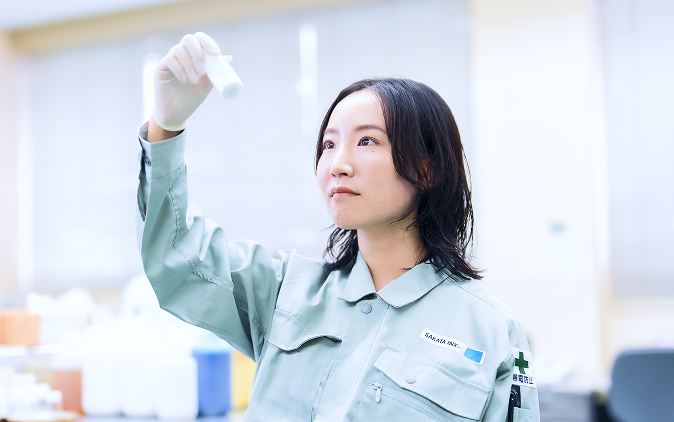 自らが設計したインキ・ニスが使用された商品を日常生活の中でふと目にしたとき、技術者としての誇りや達成感を実感します。実際、私たちの身の回りにはサカタの製品が使用された印刷物で溢れています。当社はB to B企業であり、消費者と直接的に接する機会は少ないものの、私たちが手がけたインキ・ニスは印刷工程を経て、パッケージのデザインや商品ラベルの文字など、最終製品の一部として形を変え、消費者の目に触れる存在となります。製品開発の過程で、上司や先輩から助言を受けながら、営業部や顧客と連携して完成させた製品が店頭に並ぶ姿を目にしたとき、自分の仕事が社会に貢献していることを改めて実感し、大きなやりがいを感じます。