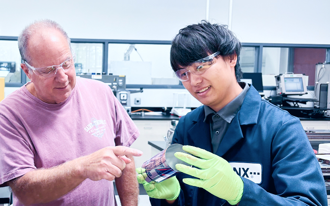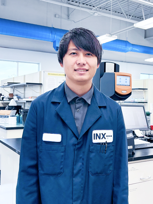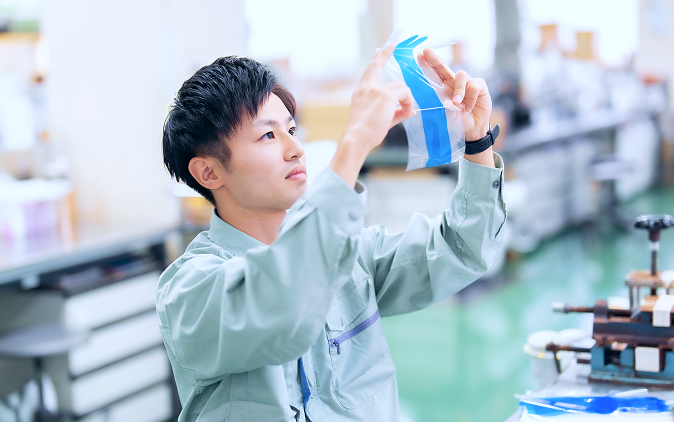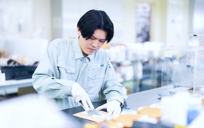 ラミネート用インキのチーム責任者として、日々の顧客からのトラブルや要望に対して原因を調査し、対策や改良を検討しています。また、新規案件に応じて製品設計や改良を行ったり、BCP対策やコストダウンとして原材料の模索を行い、製造部門と連携して試作や立上げを進めます。営業部門の担当者と共に顧客を訪問し、技術説明や印刷テストにも立ち合います。さらに、社内では部下のテーマ進捗を確認し、フォローを行っています。